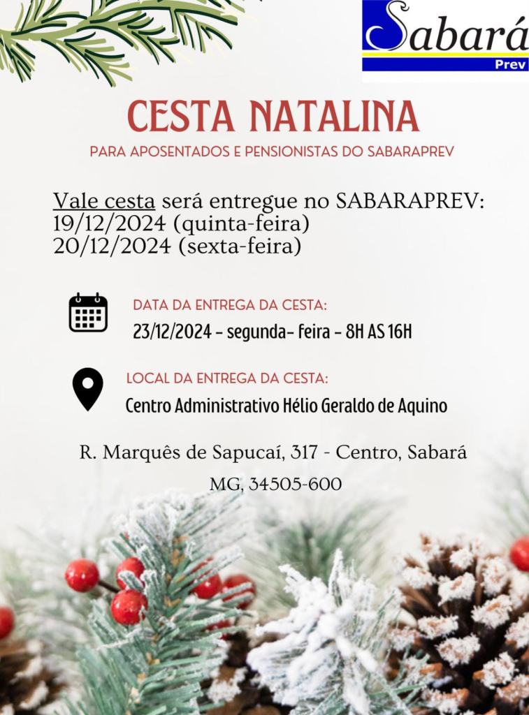A entrega da Cesta Natalina para os aposentados e pensionistas do SabaraPrev será na próxima segunda feira, dia 23/12/2024, no Centro Administrativo Prefeito Hélio Geraldo de Aquino, Rua Marquês de Sapucaí, 317, Centro, de 8h às 16h. Os cartões podem ser retirados na Sede do SabaraPrev, nos dias 19 e 20/12.